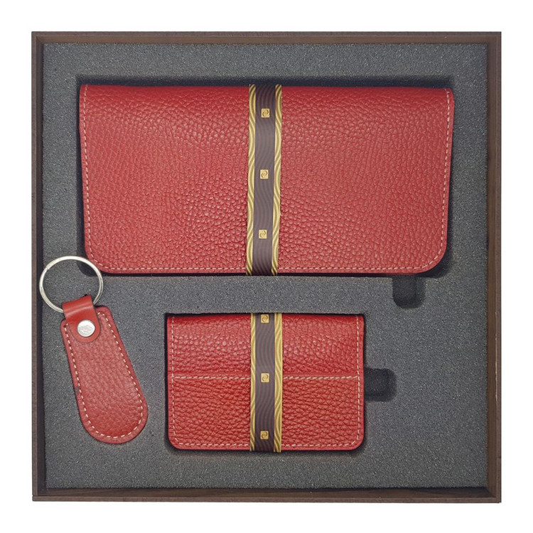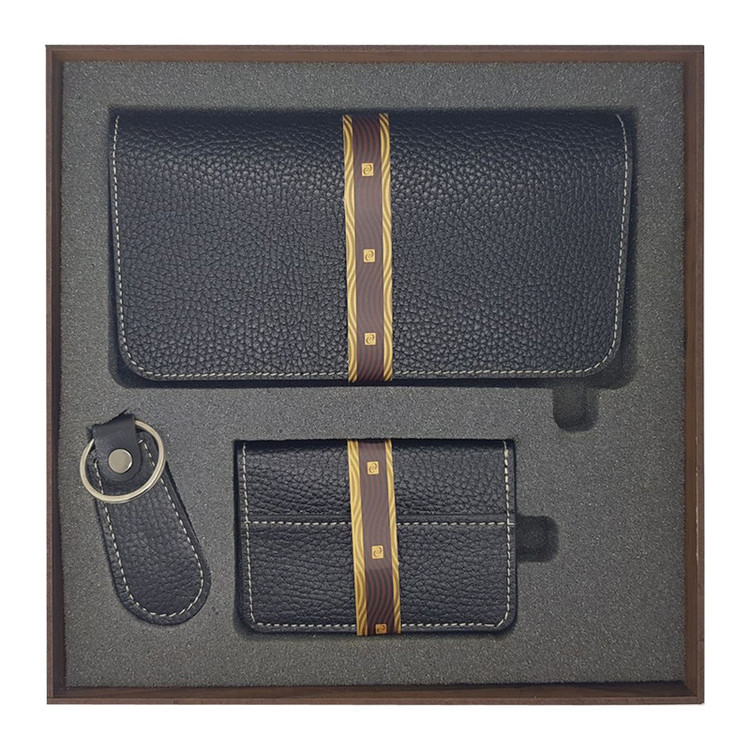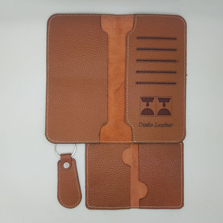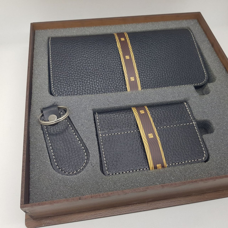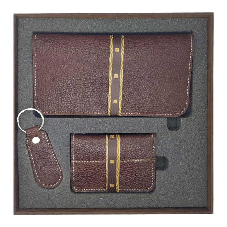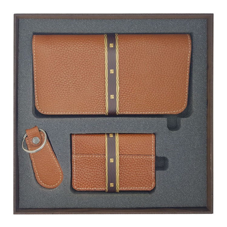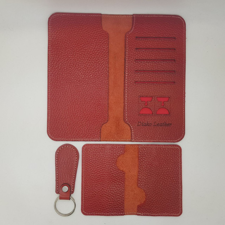 ست سه تکه چرم دیاکو مدل 255 شامل یک کیف پول و جاموبایلی، یک جا کلیدی حلقه ای و یک جا کارتی می باشد. کیف پول شامل یک محفظه جهت قرار دادن موبایل تا 6 اینچ، 5 جای کارت اعتباری ویک محفظه جهت قراردادن اسکناس و دو فضا جهت قرار دادن سیمکارت موبایل می باشد. جا کارتی دارای دو فضاجهت قرار دادن کارت های ویزیت و یا کارت های اعتباری می باشد. جا کلیدی حلقه ای با یراق آلات با کیفیت و زیبا می باشد. تمامی محصولات ساخته شده از چرم طبیعی و یراق آلات مرغوب می باشند.محصول به همراه یک جعبه چوبی شکیل ارسال میگردد که برای کادو دادن مناسب است.